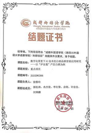 经学院科研管理部门审核,我院徐雅玲教授主持的重点科研项目《数字化背景下AI技术的白酒品牌营销应用研究——以“沪宜遵”产区白酒为例》(课题编号:ZGGSDWCB06)已达到结题标准,符合结题要求,现准予结题。