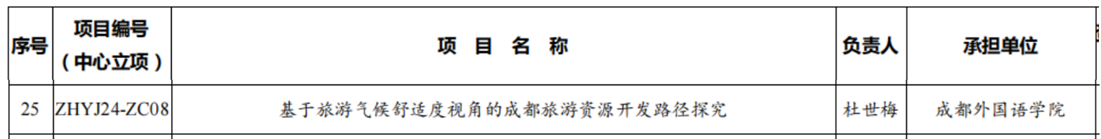 8月1日,我校国际商学院杜世梅老师申报的《基于旅游气候舒适度视角的成都旅游资源开发路径探究》(课题编号:ZHYJ24-ZC08)获四川省高校人文社会科学研究基地气象灾害预测预警与应急管理研究中心2025年度开放课题立项。该课题从旅游气候舒适度视角出发,深入探究如何基于当地气候条件,更好地开发成都本地特色旅游资源,并提出与之适配的开发路径,以提升成都旅游吸引力与游客体验。