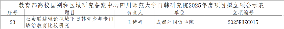 12月8日,经评审后公示,教育部高校国别和区域研究备案中心四川师范大学日韩研究院2025年度项目正式立项。我校亚非语言学院王诗卉老师申报的《社会联结理论视域下日韩青少年专门矫治教育比较研究》(课题编号:2025RHZC015)获批立项。项目立足社会联结理论视角,系统比较日韩两国青少年专门矫治教育的实践模式、运行机制与实施成效,探究社会联结对青少年矫治的作用逻辑及跨文化经验借鉴。
