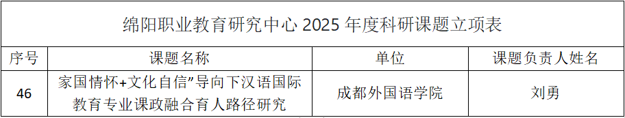 12月29日,据有关规定,专家审定后经公示,绵阳职业教育研究中心确定70个项目为中心2025年度立项科研课题。我校国际语言文化学院教师刘勇申报的《家国情怀+文化自信”导向下汉语国际教育专业课政融合育人路径研究》(课题编号:MY2025ZX669)获批立项。课题以 “家国情怀 + 文化自信” 为双导向,聚焦汉语国际教育专业,探索课政融合的育人路径。