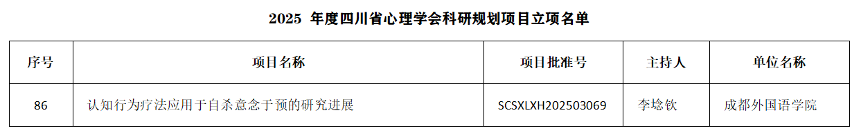 12月31日,据有关规定,专家审定后经公示,四川省心理学会公布了2025年四川省心理学会科研规划项目立项名单。我校心理咨询中心教师李埝钦申报的《认知行为疗法应用于自杀意念于预的研究进展》(课题编号:SCSXLXH202503069)获批立项。课题针对认知行为疗法在自杀意念干预中的应用价值与发展动态展开研究。