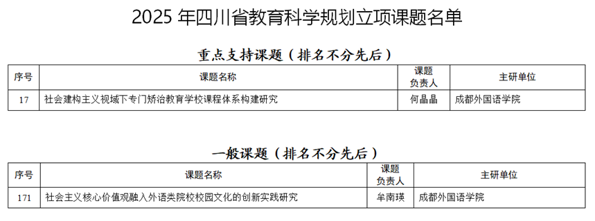 11月6日,经专家评审、教育厅同意,2025年四川省教育科学规划课题500项立项名单正式公布。其中,重大牵头课题10项,重大协同课题40项,重点课题20项,重点支持课题70项,一般课题360项。我校喜获两项立项,其中科研处处长何晶晶主持的《社会建构主义视域下专门矫治教育学校课程体系构建研究》(课题编号:SCJG25B047)获批重点支持项目。主研人员有中东欧语言学院教师李硕,亚非语言学院教师王诗卉、樊佳琦,国际商学院教师吕辉。西欧语言学院牟南瑛副教授主持的《社会主义核心价值观融入外语类院校校园文化的创新实践研究》(课题编号:SCJG25C271)获批一般项目。两项课题立足我校外语类院校的办学特色,是我校在特色教学研究领域的又一创新探索,彰显了学校在外语教育与思政育人融合研究方面的独特优势。