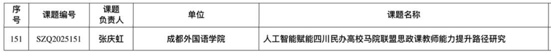 11月18日,经学校申报、专家评审,四川省教育厅公布了2025年四川省思想政治教育研究课题(思想政治理论课青年教师专项)正式立项名单。本次课题共立项204项,其中高校思想政治理论课青年教师专项课题立项96项。我校马克思主义学院张庆虹副教授申报的《人工智能赋能四川民办高校马院联盟思政课教师能力提升路径研究》(课题编号:SZQ2025151)获批立项。课题立足四川民办高校马院联盟协同优势,以人工智能技术为支撑,探索助力思政课教师的教师素养与思政教学质量双提升。